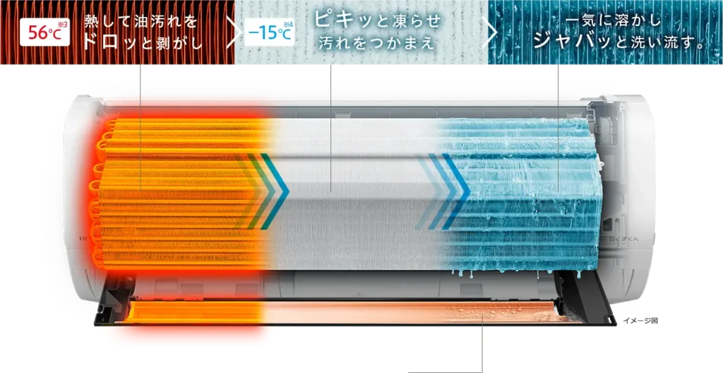 - 仕組みの魔法: エアコン内部の熱交換器をマイナス15℃まで急激に冷やして「霜」をまとわせます。この霜が、フィルターでは防ぎきれない微細なホコリや、調理で発生するしつこい油汚れをがっちりホールドします。その後、一気に解凍することで、溜まった汚れを水とともに洗い流すという、物理的かつダイレクトな洗浄方法です。